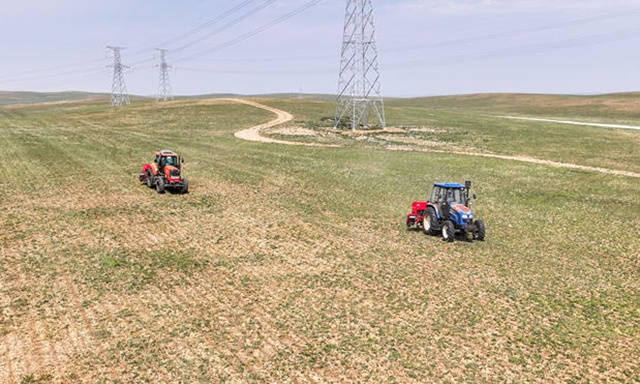 四子王旗查干补力格苏木巴音嘎查生态治理草场,免耕播种机正在进行草籽补种,恢复植被。刘志帅摄