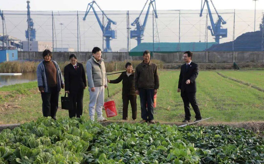 2025年12月,在案发地,江苏省靖江市检察院检察官和“益心为公”志愿者陈永强(左三)查看受损农田恢复耕种情况。